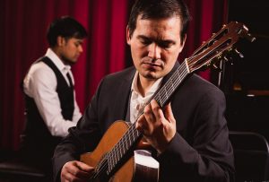 He started playing classical guitar in Malmö at the young age of nine and knew early on that he had found the thing that he would dedicate his life to. He began his formal education in the area in Spain where he studied with maestro Marco Socías at Musikene, the Higher School of Music of the Basque Country. During his time there he was awarded a Higher Diploma in Music with classical guitar as his main instrument as well as a prize in the International Guitar Competition of Azpiazu in the duet modality, in San Sebastián, Spain.
